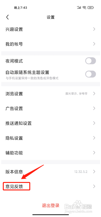 3/5第三步:进入设置,点击(意见反馈)选项。