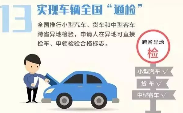 第十三条 推行跨省异地检验。在推行省内异地检验基础上,除大型客车、校车、危险货物运输车外,其他汽车实行跨省(区、市)异地检验。申请人可以在机动车登记地以外的省(区、市)直接检验,申领检验合格标志,无需办理委托检验手续,实现全国范围“通检”。对6年内免检车辆,申请人可以跨省异地申领检验标志。