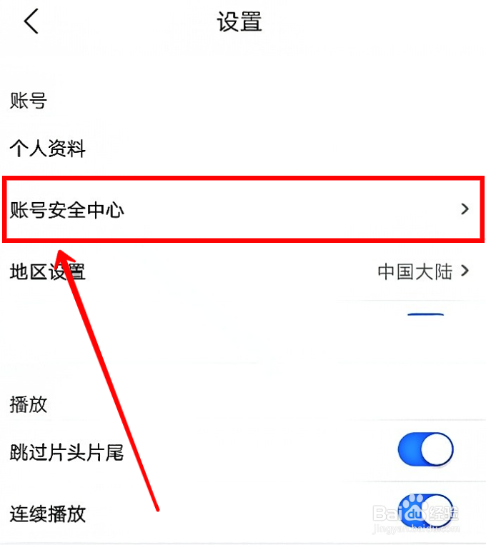 打开优酷App,在设置页面中点击【账号安全中心】。