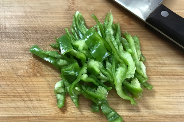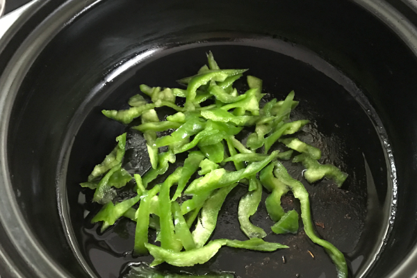 步骤10、锅中倒入少许油后把青椒放入翻炒。