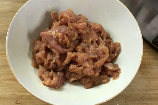 步骤3、把切成片的肉加料酒,生抽,鱼露和少许生粉拌匀后腌15分钟。