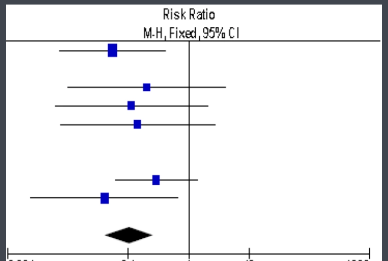 森林图展示了单个研究和Meta分析的效应估计值及可信区间。每个研究都由位于干预效果点估计值位置的方块来代表,同时一条横线分别向该方块的两边延伸出去。方块的面积代表在Meta分析中该研究被赋予的权重,而横线代表可信区间(通常为95%可信区间)。