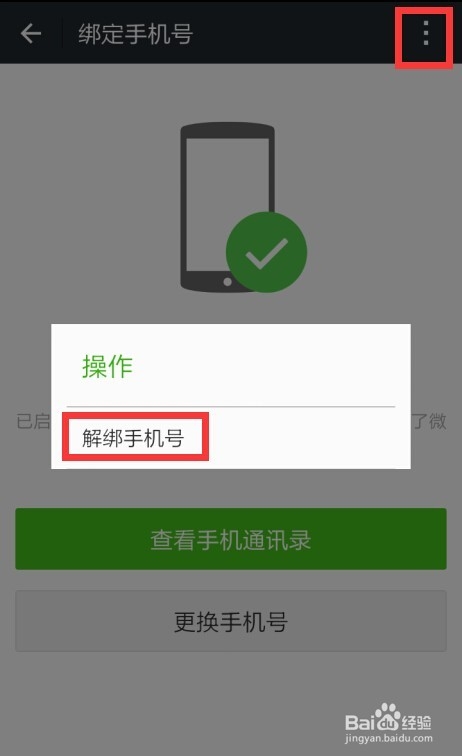 5/75、点击右上角的三个小点,然后弹出一个操作页面,上面有一个“解绑手机号”,点击他。