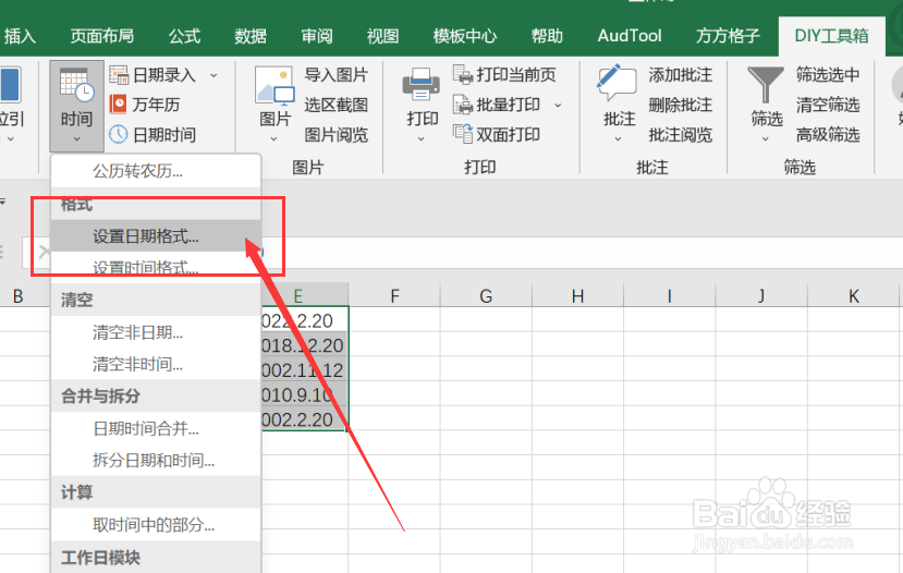 4/6点击时间选项卡后,,我们要点击下拉菜单中的“设置日期格式”选项卡。