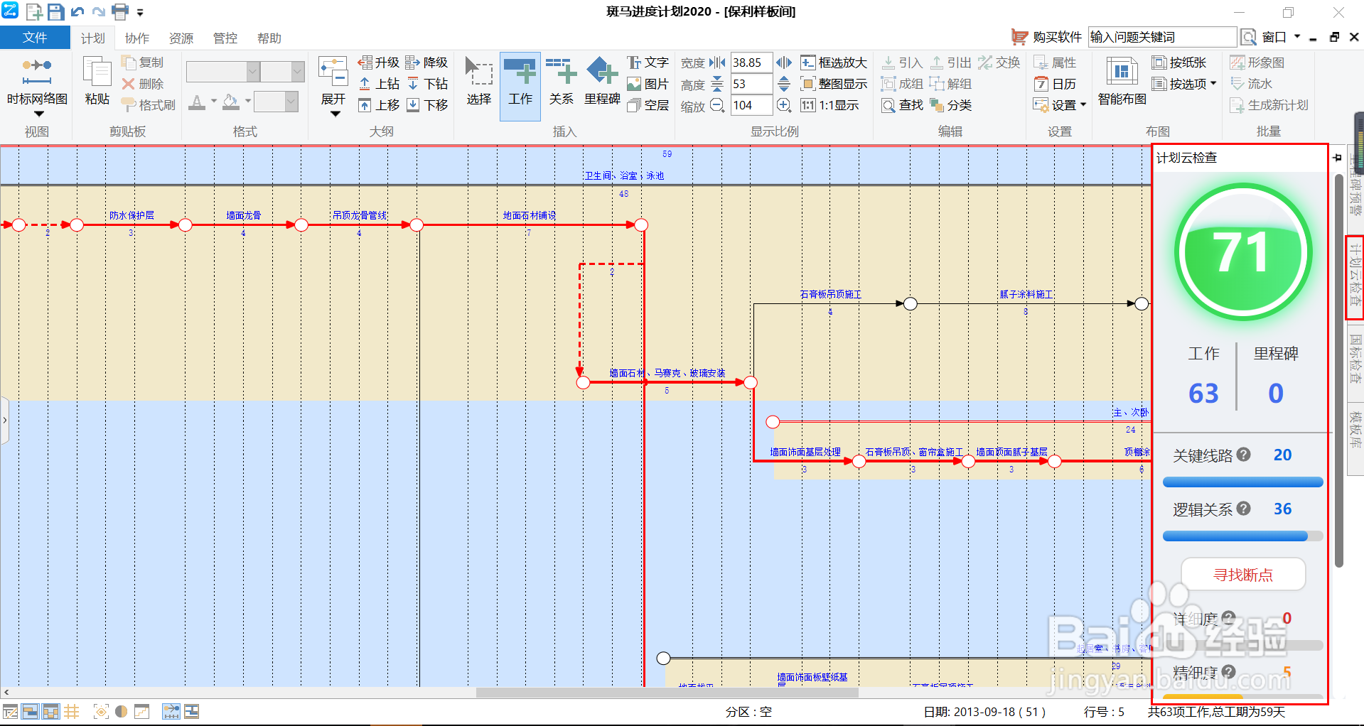 8/9根据评分寻找计划断点,并使用Ctrl+分别单击断开的工作的节点,就可以快速补全关系(为啥会有断点?答:因为Project中是以横道图表现,对于任务与任务之间的逻辑关系表现的不清晰,难免会出现断点;出现断点会导致关键路径不准确,所以建议使用双代号网络图,将任务之间的逻辑关系展现很清楚,红色的关键线路一目了然)