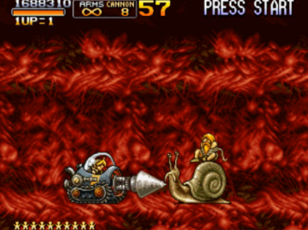 坐在装备(坦克、飞机等)里,当蜗牛快要喷到自己,但自己无法躲的时候,可以跳出装备。跳出后,玩家有1秒无敌时间。跳进装备里时视装备类型有1秒到2秒的无敌时间(普通的Metal Slug是1秒,潜水艇能有2秒)。在最后与最终BOSS决战的时候能发挥重大作用。