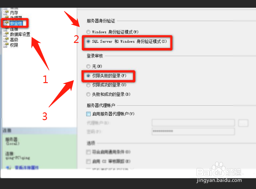 3/7在弹出的设置界面,选择安全性,并将服务器身份验证改为windows和sql server,登录审核设置为仅限失败的登录。