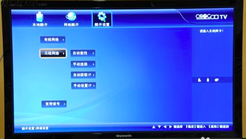 3、选择其中的“酷开设置”,选择最上面的“有线网络”,会出现和“无线网络”一样的菜单。点其中的“自动获取IP”就可以了。连接成功后,右侧会出现IP地址、网关、DNS。如果没有出现,证明没有连接上。