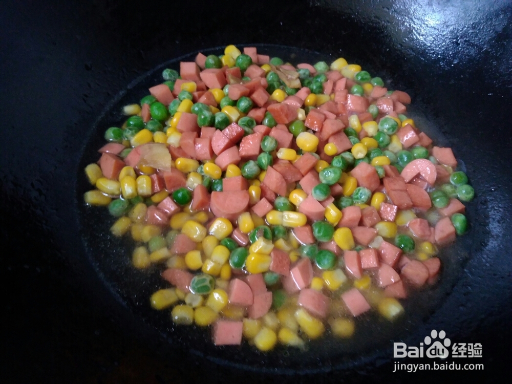 火腿肠、青豆和玉米切成丁,用开水烫一下。