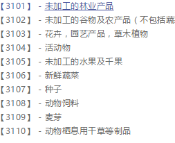 未加工的农业、水产养殖业、园艺、林业产品;未加工的谷物和种子;新鲜水果和蔬菜,新鲜芳香草本植物;草木和花卉;种植用球茎、幼苗和种子;活动物;动物的饮食;麦芽。