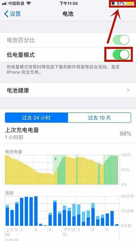 5、选择“开启”低电量模式,屏幕右上角电池颜色变成“黄色”即可使iPhone 6s升级到最新系统后耗电严重有效降低。