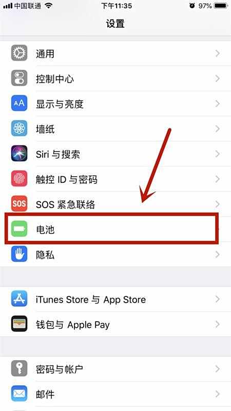 3、进入iPhone 6s 的“设置”中心后,打开“电池”功能,进入下一步。