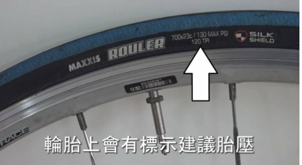 外胎上面通常会留下关于这个外胎的规格,以上图的例子来说,700 是指整组轮组加上外胎的直径大约是700 mm, 23c 指的是轮胎的宽度,大约是 23mm。如果是山地车的外胎最常看到的就是 26’ x 1.75 这种规格,这里使用的单位是寸。