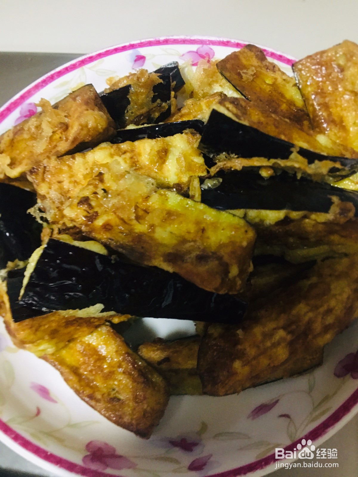4/9锅中多倒入金龙鱼橄榄调和油,油热,把茄子到进来炸一下,全程开大火炸,小火炸茄子容易吸油,炸至两面金黄就可以了