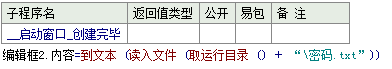 编辑框2.内容 = 到文本 (读入文件 (取运行目录 () + “\密码.txt”))