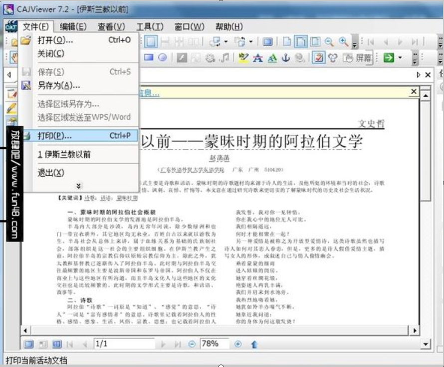 1、打开要转换的CAJ文件,选择”文件“→”打印“,也可直接点击工具栏的打印机工具,或者快捷键CTRL+P;
