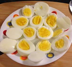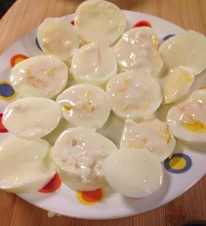 1、水煮鸡蛋剥壳,每个蛋切成3-4片。