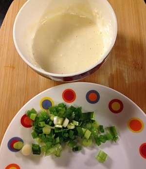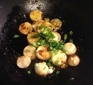 5、放入葱花,淋上少许味淋、料酒、白醋、油,起锅