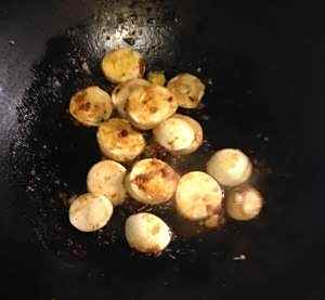 4、蛋块小火下锅煎至面糊略焦黄,拨开蛋块,在空处炒香辣豆瓣酱,并加入酱油、糖、胡椒粉,与蛋炒匀。