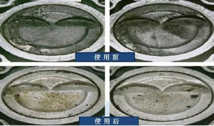 使用燃油宝后,缸内活塞头部的积碳情况有了明显的改善,一些积碳比较薄的地方已经被清除掉,而一些积碳比较厚的地方也出现了“橘皮状的褶皱”,这种形态表明积碳已经开始“松动”,已经开始被清除。