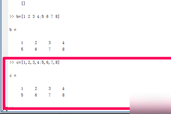3、在MATLAB中,也可以使用逗号+分号的形式创建数组。每一行的各个元素使用逗号隔开,换行时使用分号隔开。每一行的元素个数需要相同,如果每一行的元素个数不同,MATLAB会报错。