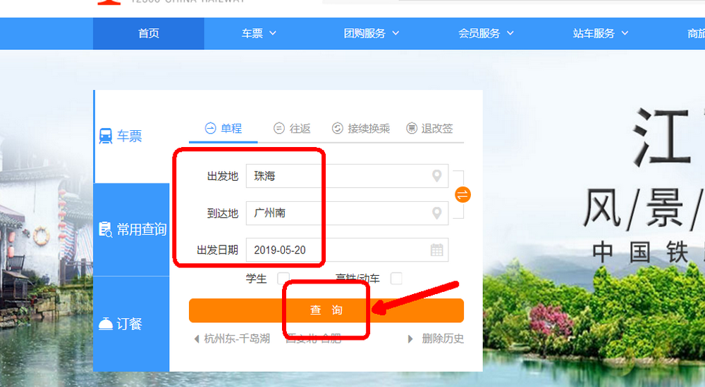 2、在出发地输入珠海,在到达站输入广州南,点击与之匹配的关键词,