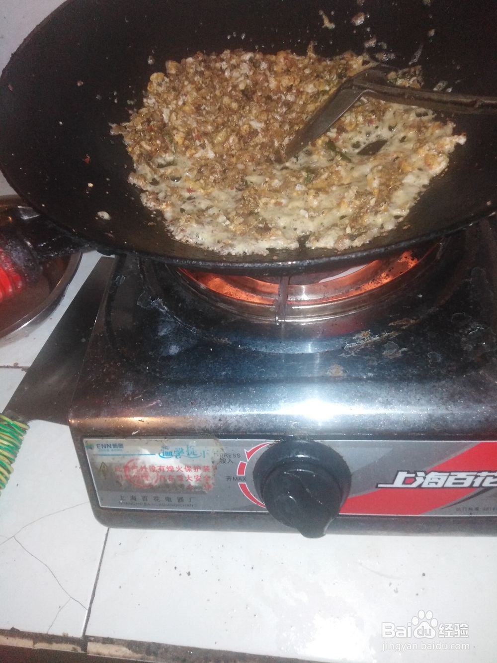 3/3看见锅内油炒着蛋,蛋逼着辣椒酱一起欢叫时撒入葱花翻炒真香好下饭熄火出锅。