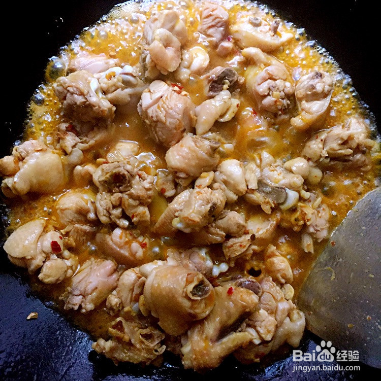 3/7将姜、蒜、老干妈放入热油中煸香 往锅中放入鸡块儿 翻炒
