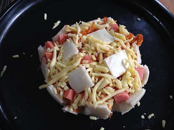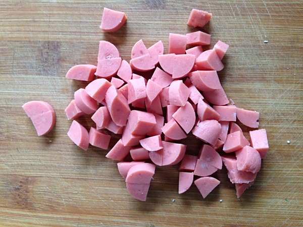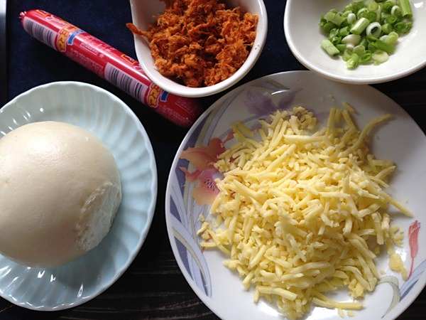 准备材料:馒头1个、火腿肠1根、马苏里拉芝士碎适量、肉松少许、蛋黄液少许。