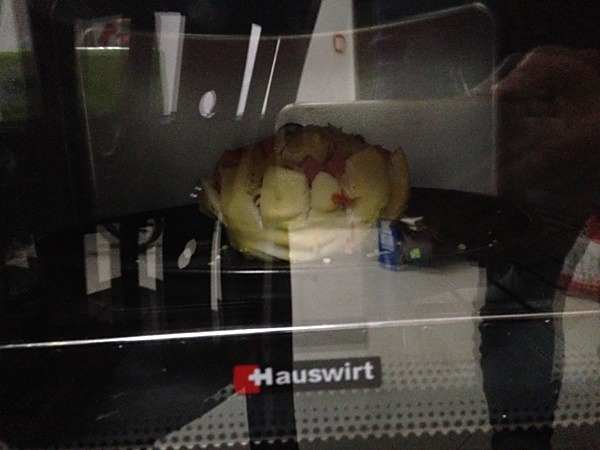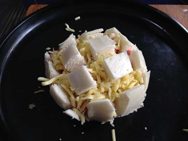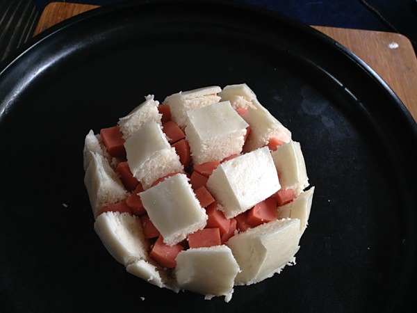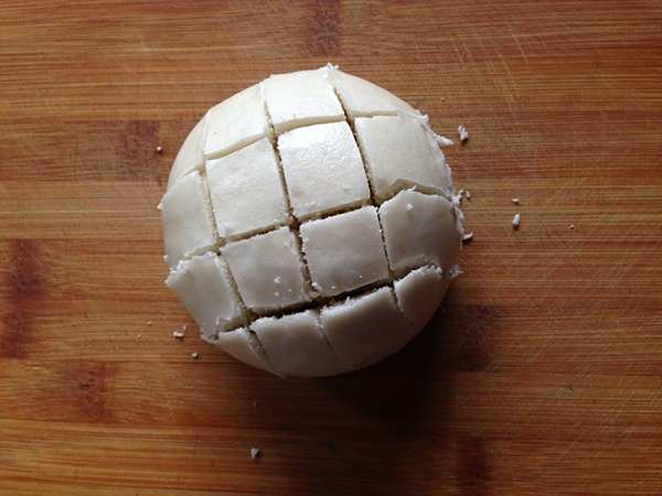 2、将馒头切成如图的网格状,底部不要切断,如果馒头太硬可以微波10秒回软。