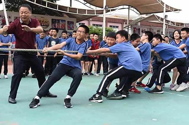 拔河比赛是低年级、中年级、高年级都喜欢做的游戏之一。一般情况下,我们出动的学生人数都在30人以上,他们开心的分成两组,准备好架势之后,就玩起了拔河比赛。一般情况下是三局两胜,每次都能让孩子们玩儿得很尽兴,因为拔河比赛锻炼的是孩子们的集体主义精神。