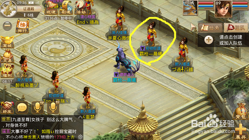 3/7进入证道殿以后,我们去找男方或者女方(看自己角色性别)适合自己等级的挑战,最开始是70-79,下一个是80-89,小编是89。点击我要挑战你。