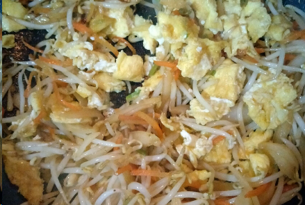 面皮500g、豆芽100g、面筋40g、油20g、盐5g、生抽5g、蒜5g、胡萝卜50g、洋葱50g、醋5g、鸡精5g、鸡蛋2个。