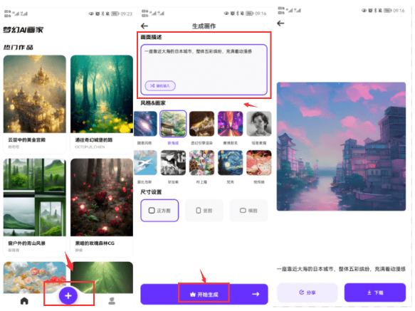 在手机的应用商店里去下载安装好梦幻AI画家app之后,打开软件然后登录账号,软件支持第三方登录,然后就可以在这里开启你的创作,软件的界面设计的是很简约的,大家在软件的首页可以看到下方有个“+”号,然后就可以点击“+”号进入创作编辑界面,大家在软件页面的输入框里输入关键词条就可以,词条框的下方为大家提供了风格选择以及尺寸设置,大家在一切都编辑好之后就可以进行创作了,整个的过程都是很简单的,一起来看看吧!