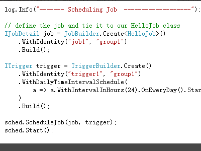 5、然后利用JobBuilder建立任务关联到我们刚才创建的任务逻辑,在创建一个触发器,用来明确此任务在什么时间点执行,执行几次,最后执行start,即可进行任务。