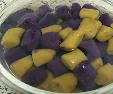 2、紫薯,甜薯蒸熟后,分别碾碎,然后加入木薯粉揉成面团块。