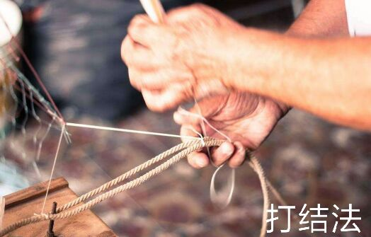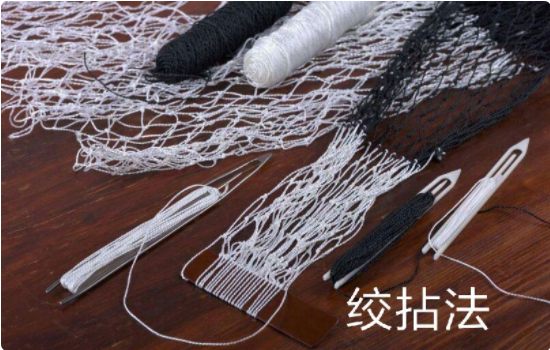 是传统的制作渔网方法,渔网厂渔网用经线和梭子里的纬线套结而成,结节大小是网绳直径的4倍,突出于网衣平面。