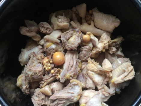 步骤四、鸡肉焯过水之后,捞出洗净,把鸡肉放入高压锅胆中。见下图:
