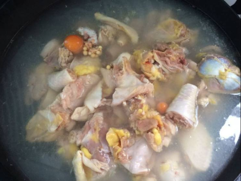 步骤三、锅中放入水,烧开,放入鸡肉焯一下水,去除血水。见下图: