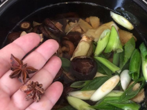 步骤六、在放入2个八角,倒入少许料酒,加入适量生抽,老抽。见下图: