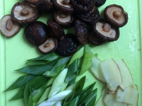 步骤二、干香菇泡发,洗净,葱切斜段,姜切片。见下图: