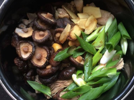 步骤五、放入葱,姜,香菇。见下图: