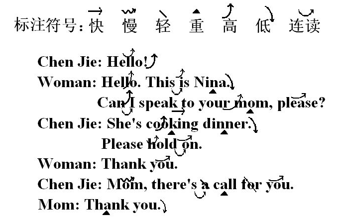 语调(intonation),即说话的腔调,就是一句话里声调耕敏(pitch)高低抑扬轻重的配制和变化。世界上没有一种语言是用单一的声调说出的,以英语为例,英语有五种基本语调:升调(↗)、降调(↙)、升降调(∧)、降升调(∨)以及平调(→)。