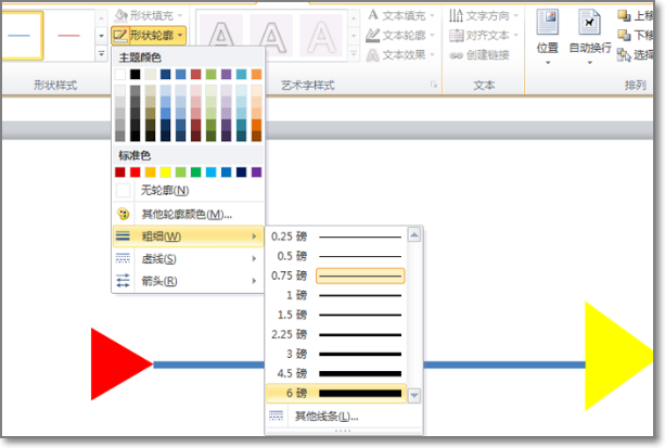 4,再次执行插入-形状命令,选择直线并绘制直线,设置粗细我6磅,颜色为蓝色。