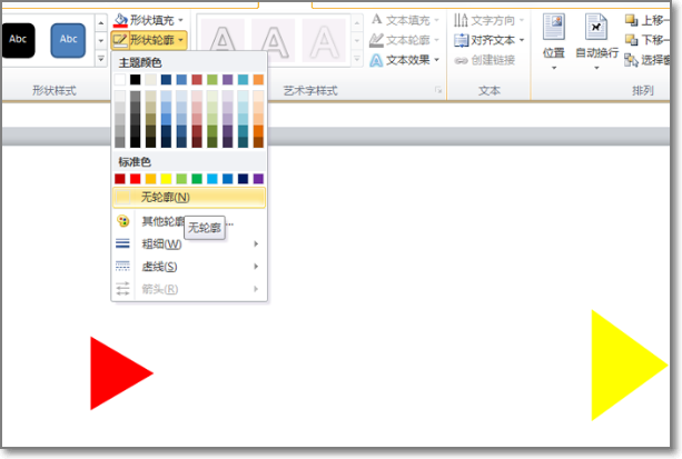 3,依次选择两个三角形,分别设置形状填充为黄色和红色,形状轮廓为无轮廓。