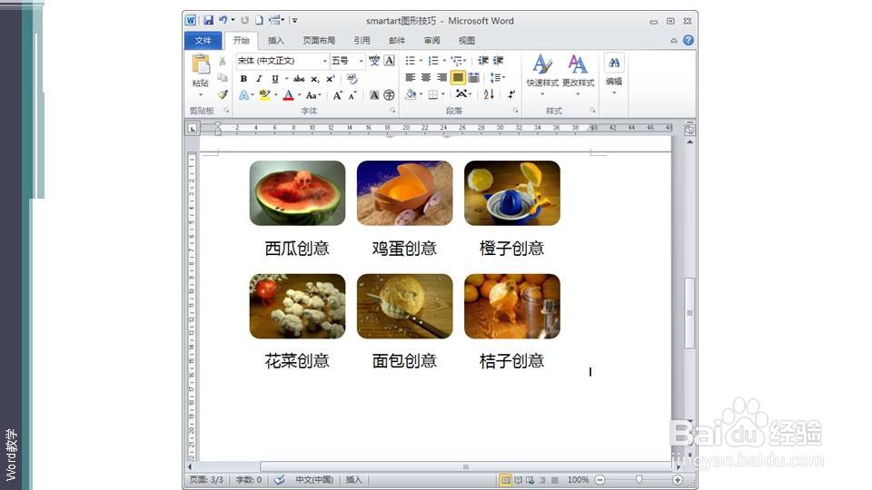 在word里smartart是图形制作的利器,但类型非常多样,应用也有很多变化,下面就图片题注列表进行一些应用展示。工具/原料moreWord方法/步骤1/6分步阅读