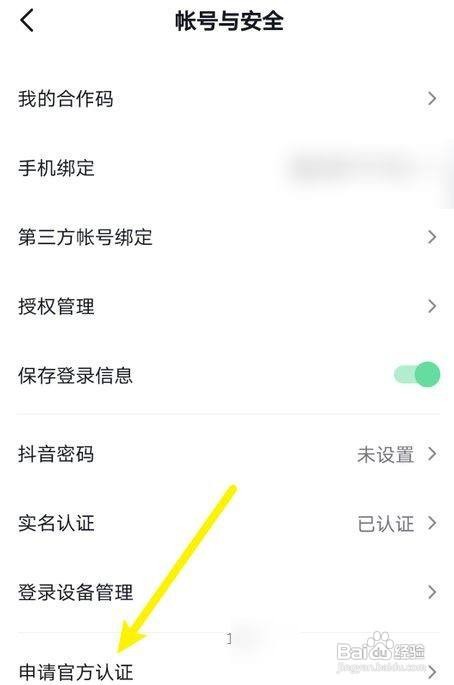 第一步,打开手机上的抖音app,在帐号与安全页面,点击官方认证。