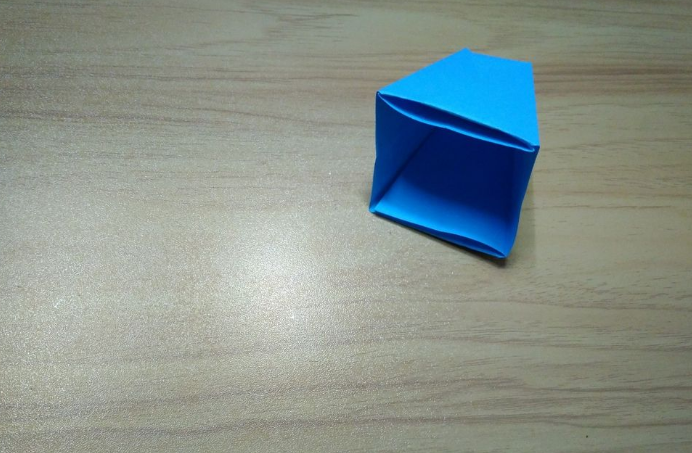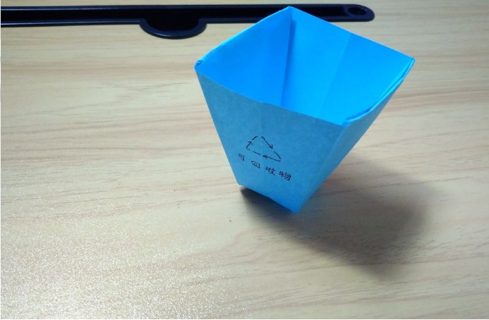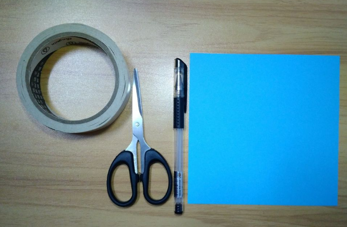 需要材料:蓝色彩纸15*15厘米1张、黑色水笔1支、剪刀1把、双面胶1卷