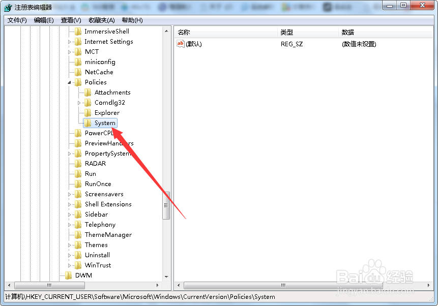 4/8第信昆驼四步,依次定位到HKEY_CURRENT_USER\Software\Microsoft\Windows\CurrentVersion\Policies\System项,如果没有System项,则新建一个。