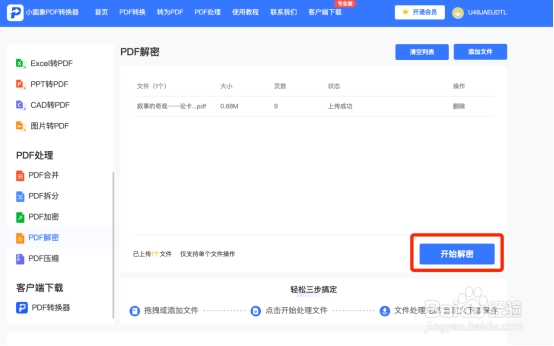 文档上传成功后点击【开始解密】,接下来的事情全部交给它来处理,我们无需再进行多余的操作,等文档处理的进度条加载完成,我们把新文档自定义保存下来,这样我们就收获了一份没密码的PDF文档了。